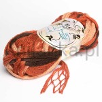 Bardzo ciekawa, ale zarazem specyficzna nitka. Forma tasiemki z doczepioną siateczką jest świetną alternatywą dla osób które szybką chcą zobaczyć efekty swojej pracy. Włóczka tworzy przepiękne falbanki i jest bardzo leciutka. Producent zaleca do robienia szali, ale świetnie wygląda jako spódniczka dla małych dziewczynek, wykończenie ubrań lub wykonania ozdobnych poduszek.